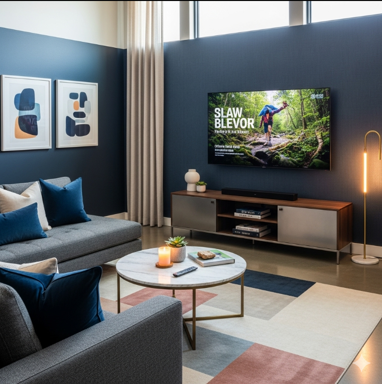 Picture a sleek, modern space adorned with plush social seating, perfect for gathering friends and family. Install top-of-the-line entertainment technology, like a large-screen TV and surround sound, creating an immersive movie experience.